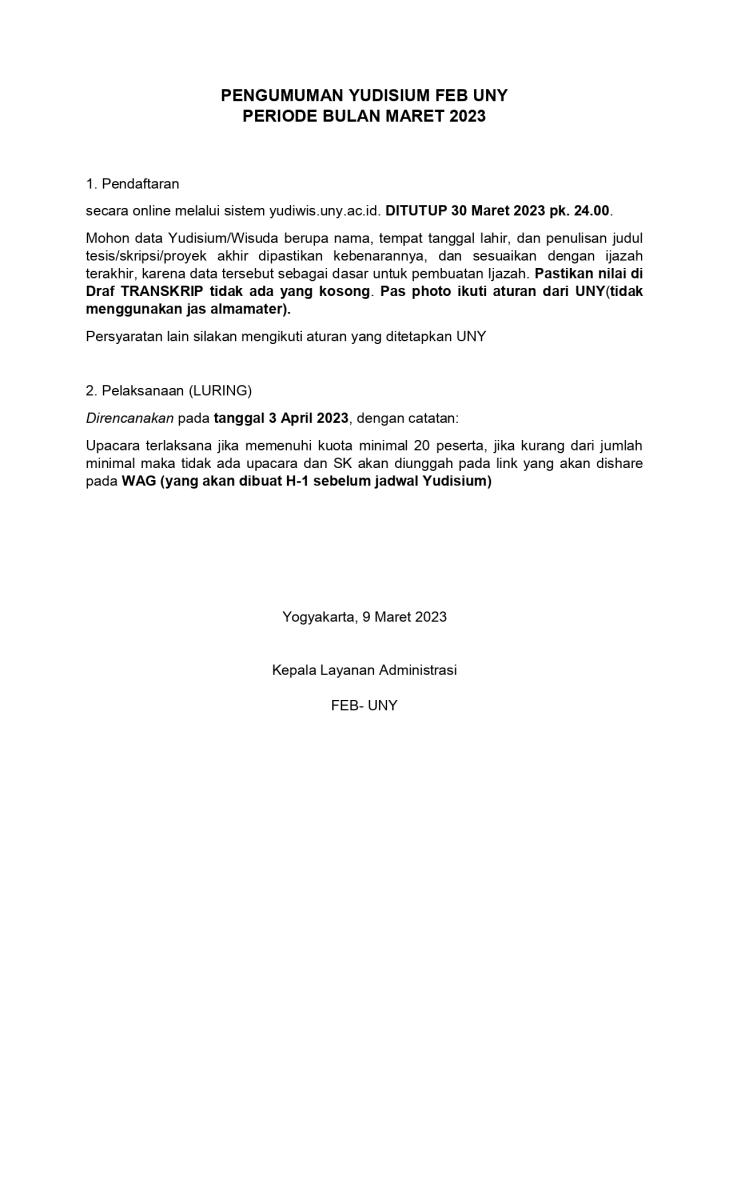 PENGUMUMAN YUDISIUM PERIODE MARET 2023 FEB UNY