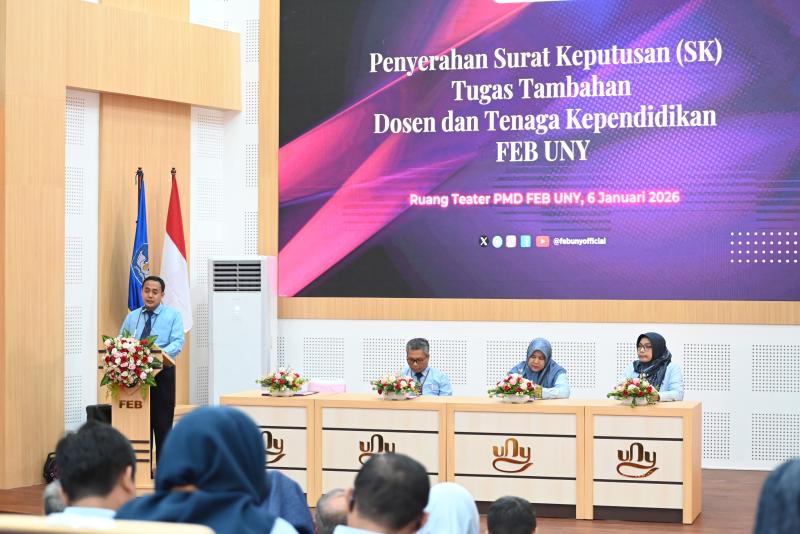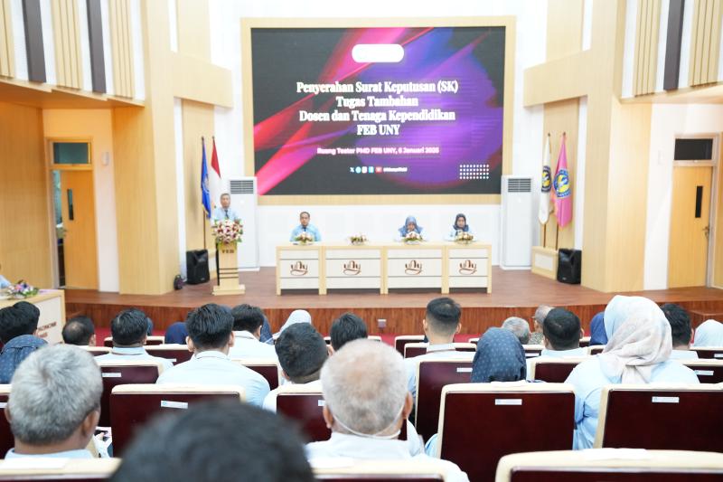 Fakultas Ekonomi dan Bisnis Universitas Negeri Yogyakarta (FEB UNY) menyelenggarakan acara penyerahan Surat Keputusan (SK) Tugas Tambahan bagi dosen dan tenaga kependidikan pada Selasa, 6 Januari 2026, bertempat di Ruang Teater PMD FEB UNY. Kegiatan ini dihadiri jajaran dekanat, ketua dan sekretaris departemen, kepala dan sekretaris bagian, koordinator program studi, serta dosen dan tenaga kependidikan yang menerima penugasan tambahan.
