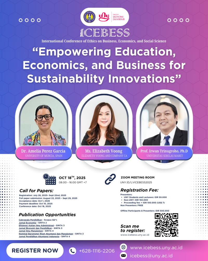 The Faculty of Economics and Business, Universitas Negeri Yogyakarta, proudly invites academics, researchers, practitioners, and students to participate in ICEBESS 2025 — an international forum featuring distinguished speakers from around the globe to discuss sustainable innovations in education, economics, and business.